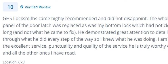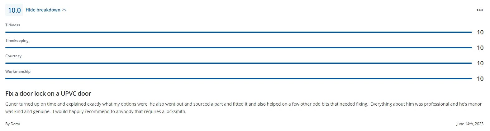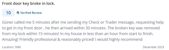 Guner arrived very promptly (within half an hour). He assessed the situation and explored exactly where the door locks were operating. After a few minutes, he was able to open the lock and thus gain entry to the house. So problem solved relatively quickly and at reasonable cost. Highly recommended!